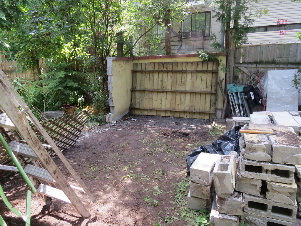 The irony in all this is that the wall was helping to keep water from our eavestrough down spout on our side of the yard. A big torrential downpour soon showed that our neighbours on the left were now being flooded by water from our roof. So their fence guy proposes a solution ... he's going to make a small wall of concrete blocks along the dividing line, essentially rebuilding a small portion of our old fence. Well, whatever, we don't want to flood anyone and we'll run our down spout to the alleyway anyway. None of this is the glamorous part, that's for sure.